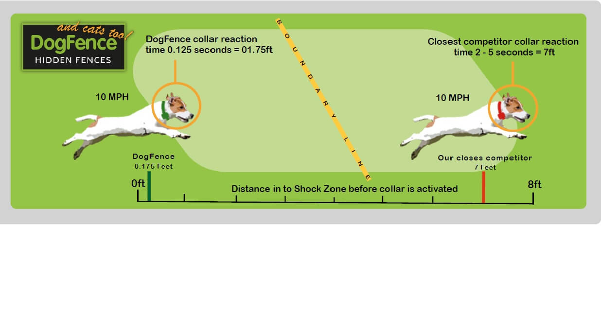 Put simply if your dog is racing towards the no go zone the collar needs to stop him before he runs into the road. With the DogFence system if he runs at 10mph he will only get 0.125ft into the zone before the collar has given a warning beep and impulse. With a freedom fence he will be at 7ft before the collar has activated. Conversely many people never consider the shut down time on the fence. What happens if the dog retreats? How quickly will the collar stop? Again, speed is crucial the start up and the shut down times are equal. If your dog retreats the FM fences will shut down in less than 1 second. With the PetSafe, Invisible Fence and Freedom Fences AM brands the time is 2 – 5 seconds. Food for thought!