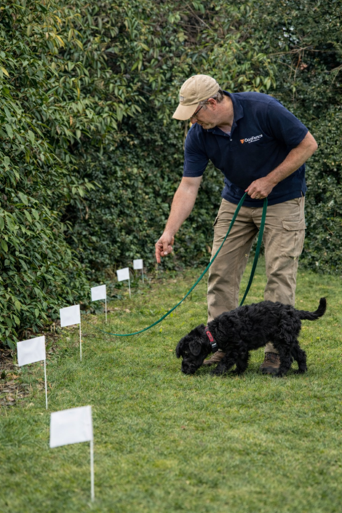 DogFence trainer guiding a young puppy on a lead during early boundary training with electronic fence flags placed along the hedge line