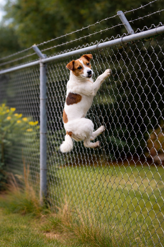 AI-generated illustration showing how a dog can jump a 6ft fence — even small breeds like Jack Russells can scale chain-link fencing when highly motivated.